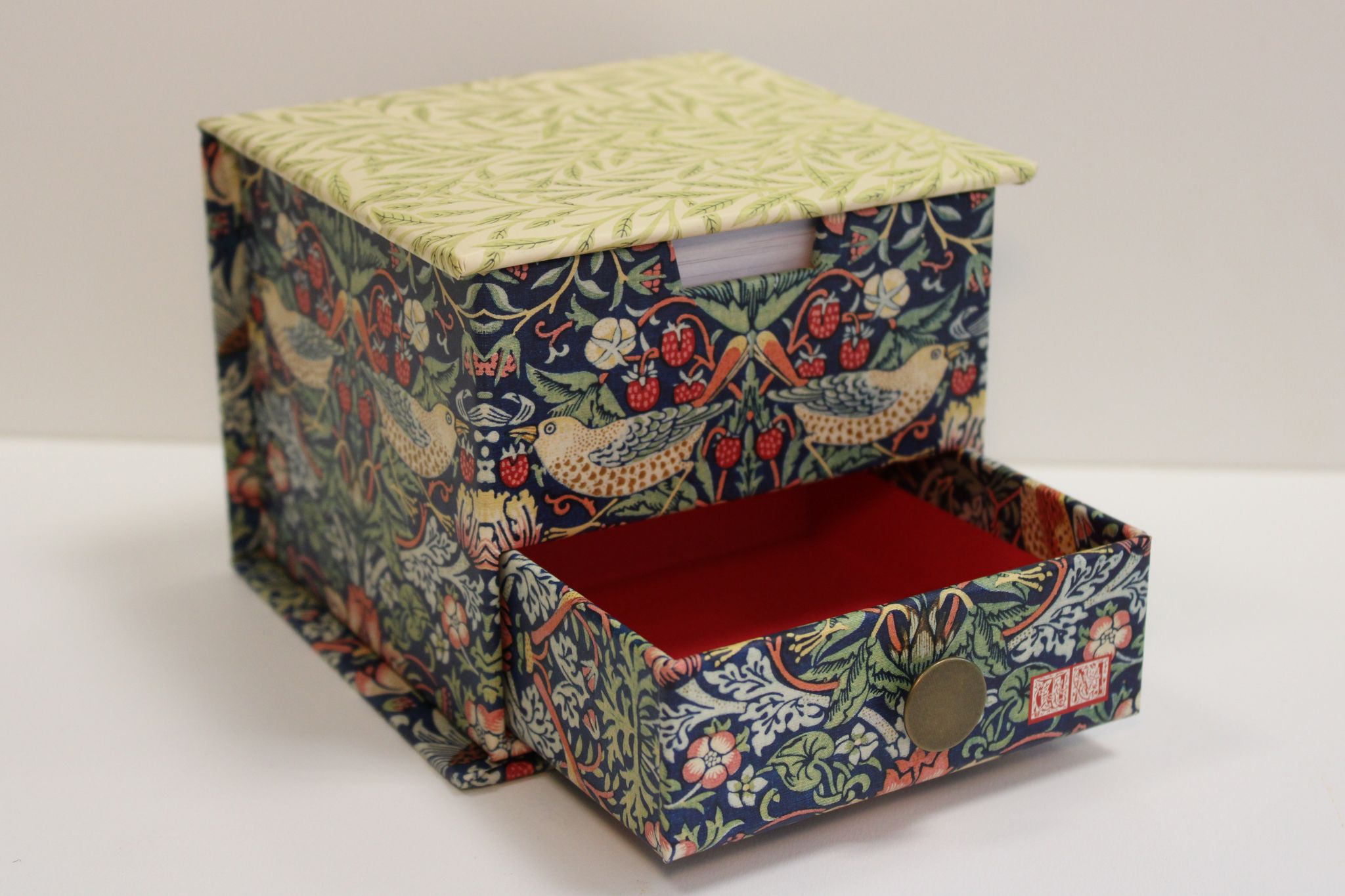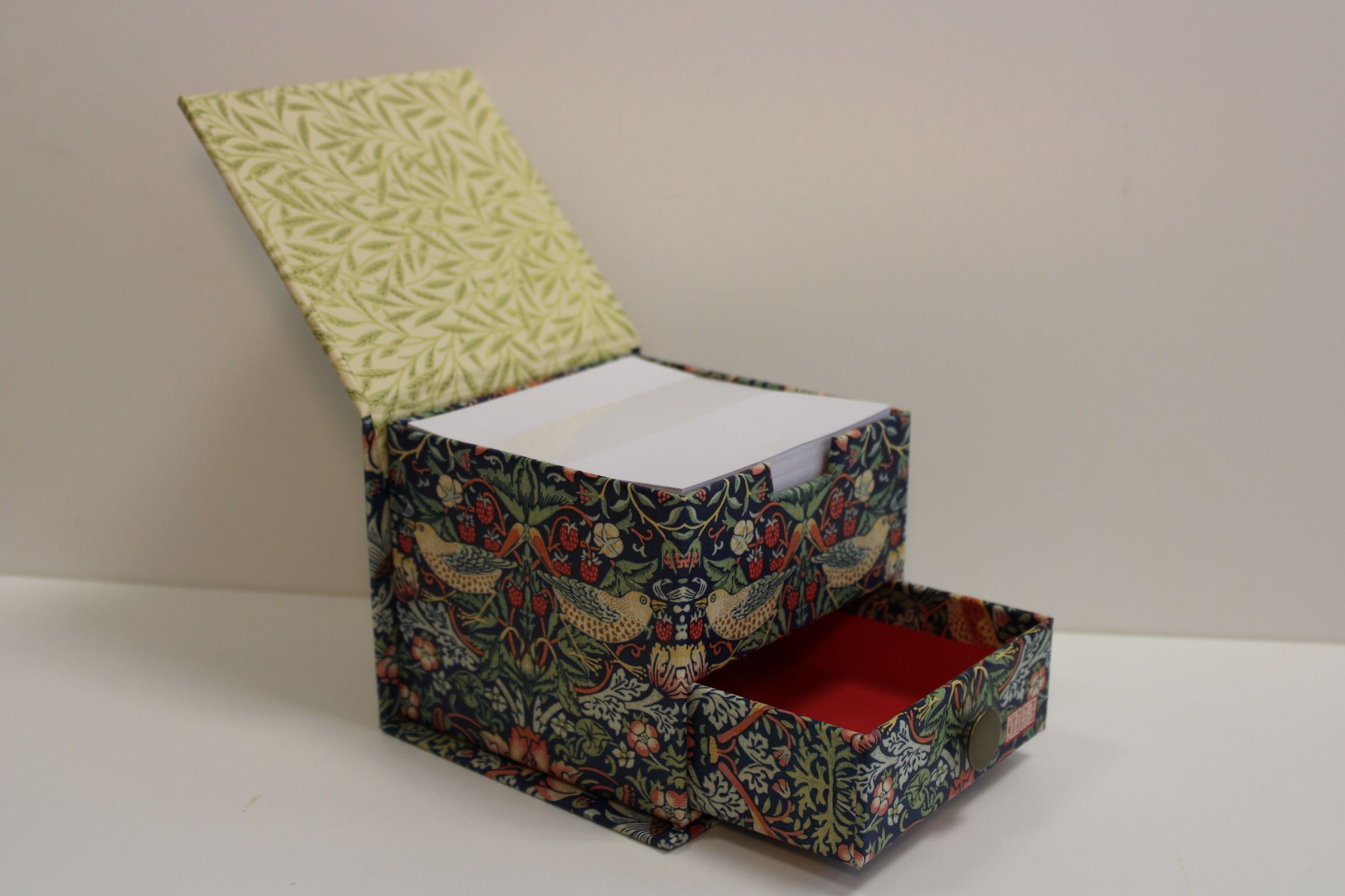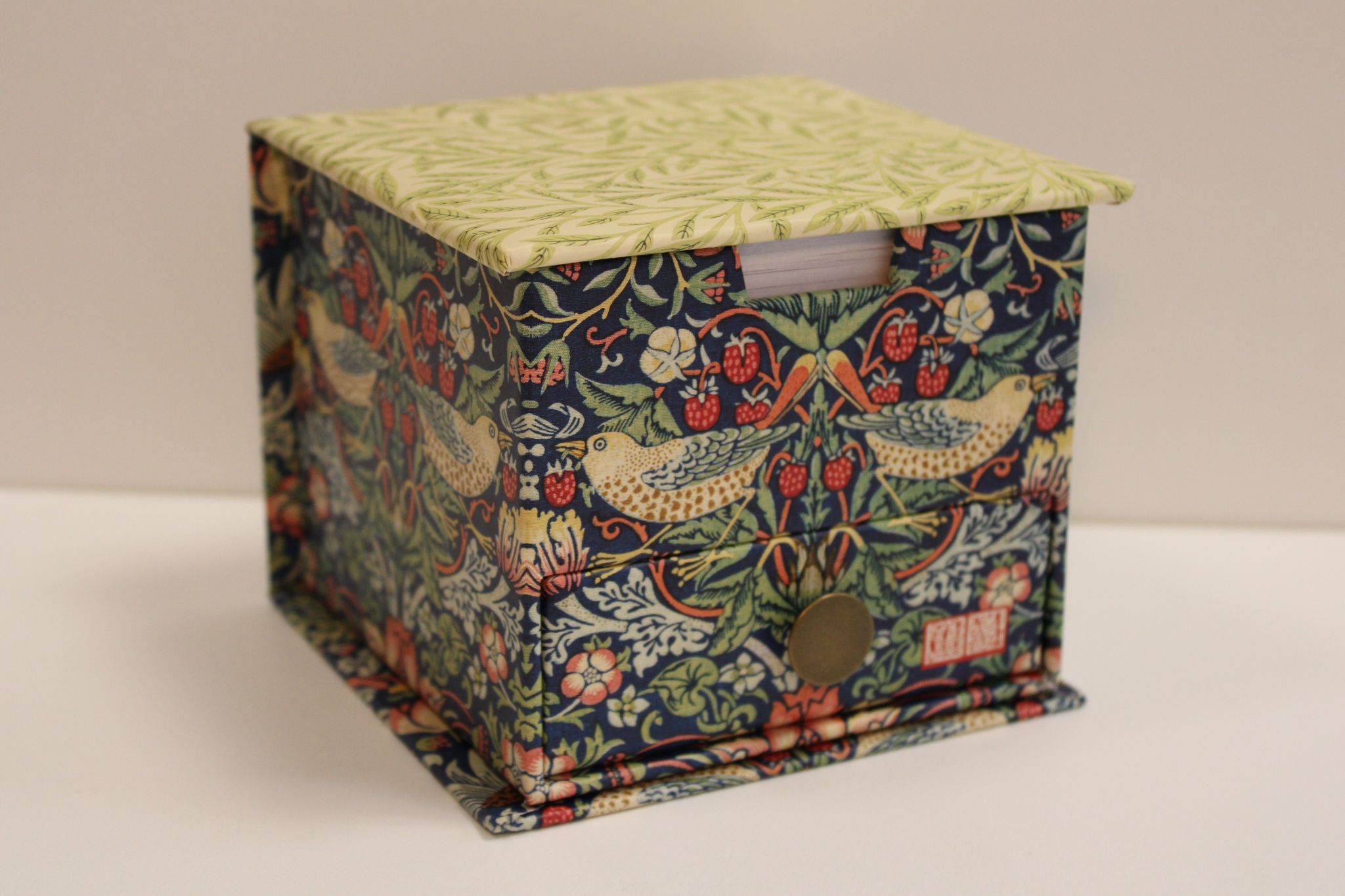 A beautifully designed notes box featuring William Morris’s iconic Strawberry Thief pattern, complete with a handy pull‑out drawer.