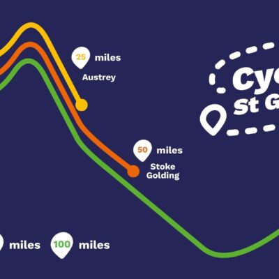 All routes start and finish at St Giles Hospice in Whittington. The 25 mile route will go to Austrey and back, the 50 mile route will continue through to Stoke Golding, while the 100 mile route goes through the first two checkpoints and on to Market Harborough before returning. Exact details of the route will be sent to you prior to the event.